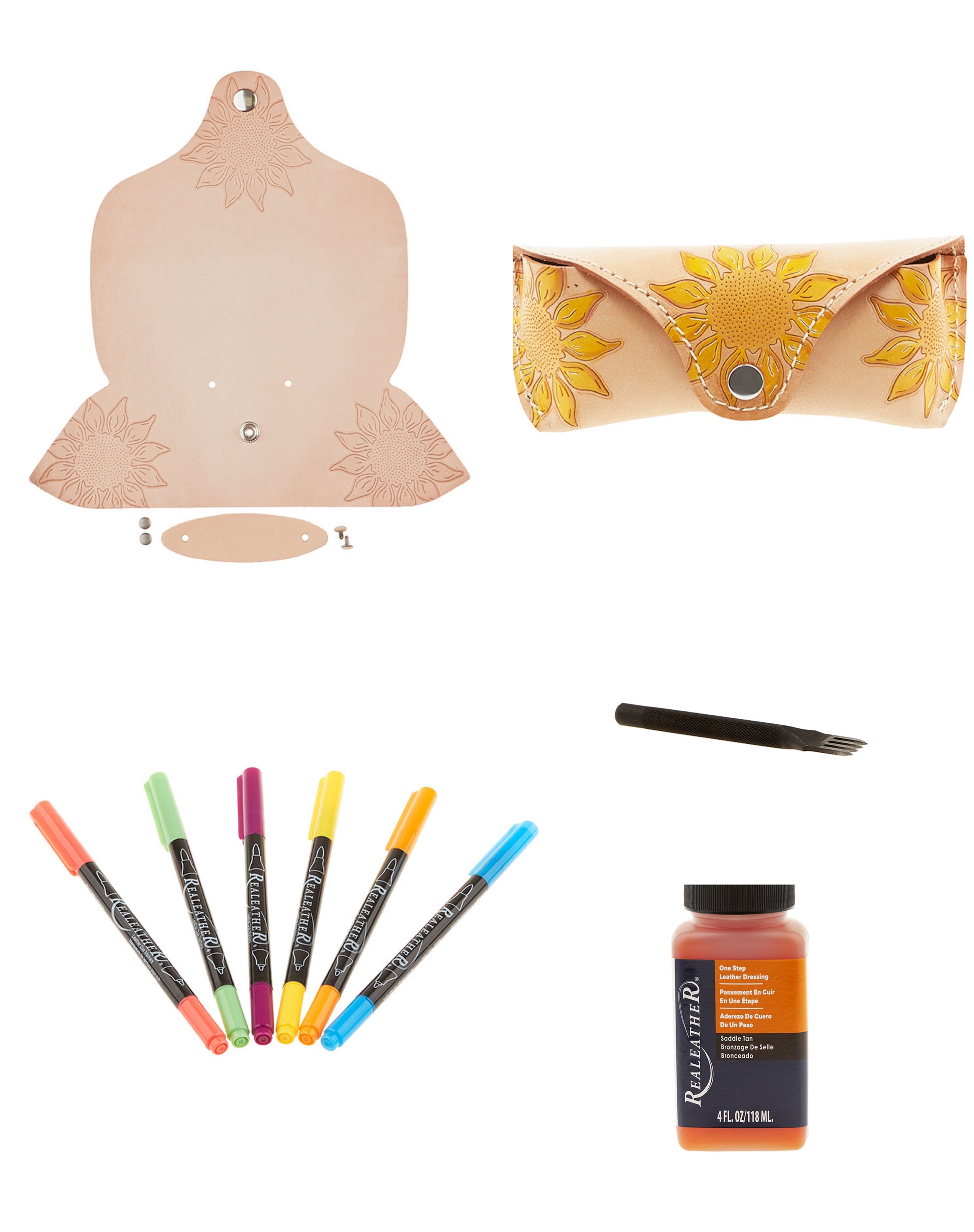 You’ll get a high-quality embossed leather piece, leather markers, stain, and a 4 prong chisel tool to create the perfect stitching holes. You can customize your eyeglass case with color and stain.